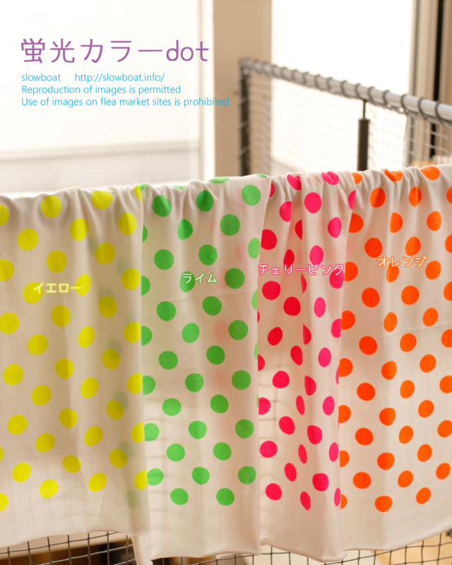 蛍光具合が画像で再現がかなり難しいので、実物との差異が気になる方は 通常販売時に無料サンプルをUPしますのでご利用のうえご注文をお願いします ●「蛍光プリント」のお取り扱いについてご注意 蛍光プリントとして一般の既製品にも多く活用されている顔料ですが 「耐光性・堅牢度」が普通の顔料に比べやや劣る特性があり 紫外線暴露により色がうすくなりやすいので、長持ちさせるために お洗濯は屋内陰干し、乾燥機不可、保管は光が届かない場所にお願いします プリント会社の一例では蛍光プリントの屋外展示販売で 退色の報告があるそうなので 当店では蛍光顔料に加え、一般の顔料インクも混ぜまして 万が一退色が発生しても色がうすくなりにくいように工夫をしてみました 顔料使用のプリントはアイロン時は当て布・中温・短時間にてお願いします ●ご了承をいただきたいプリントのリスク (A)繊維の飛び込みによるプリント抜けや インクの付着が発生する場合があります、小さなものはご了承ください。 (B)ベースのニットの収縮方向によってプリントに歪みが出ますため ドットは真円にはなりませんので予めご了承ください。 ※販売用として制作される場合は お手数ですがプリントについての注意書きや取扱のご説明をお願いします。 ※どうしても販売ができない難が発生した場合 キャンセル・御返金になる可能性がありますことをご了承ください。 …━━━‥…━━━‥…━━━‥…━━━‥…━━━‥…━━━‥… ↓↓ここからはドット柄の大きさや間隔のご参考にお願いします↓↓ …━━━‥…━━━‥…━━━‥…━━━‥…━━━‥…━━━‥… ↓Petit Bonheurさまにミニ裏毛ベースにてサンプルを作っていただきました。 お色は【カーディナルレッド】と【ピーチ】です。